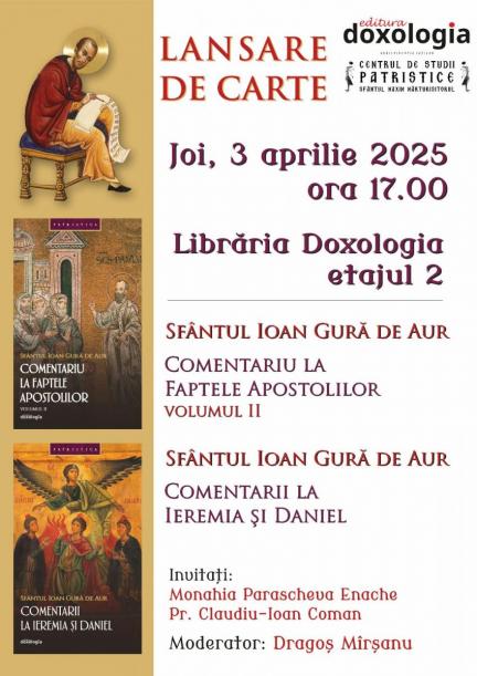 Lansarea va avea loc la etajul 2 al Librăriei „Doxologia” și face parte din seria de evenimente dedicate promovării literaturii patristice în rândul cititorilor contemporani.